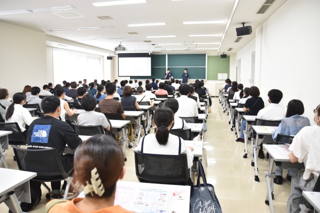 本日2限目の「大学スタディスキル」では、新入生ガイダンスとして、サークルや資格、大学院、そして就職に関する重要な情報をご紹介しました。その後の施設見学では、実際にキャンパス内を歩き、学びの場としての魅力を感じ取っていただけたと思います。途中で撮影した集合写真は、今日の思い出を残す素敵な記念となるでしょう。