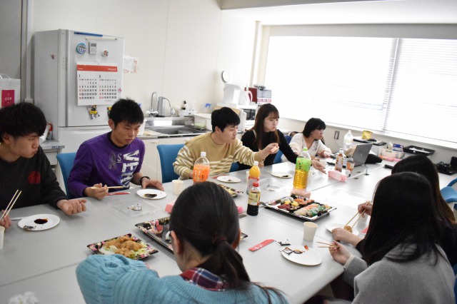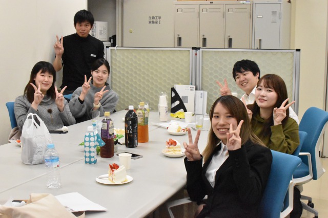卒業研究発表会が開催されました。満研の2名も発表および質疑応答で高い評価を頂いたようで安心しました。就活のない後輩の3名もお祝いに駆けつけてくれたので、皆でケーキを頂きました。約一年間にわたり一生懸命に研究して頂き有難うございました。とても良い成果を出して頂き商品化の目途もついて嬉しく思っています。最後の春休みゆっくりお過ごしください。