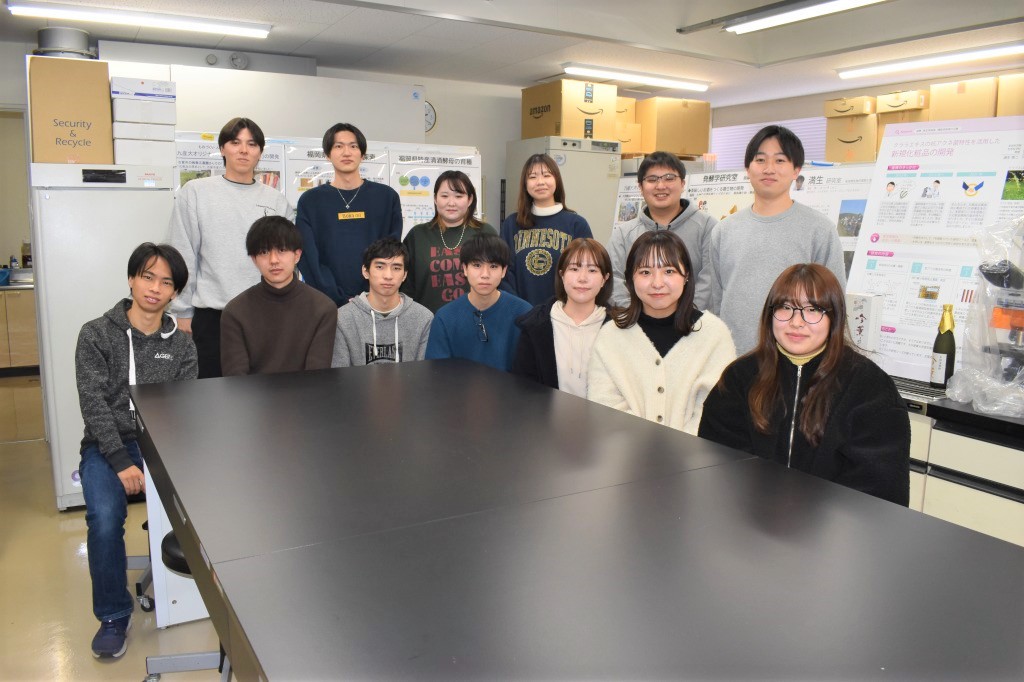 微生物は目に見えない生物ですが、食品・医薬品・新素材・エネルギーの生産、また環境浄化など私たちの暮らしを支えている大きな存在です。発酵学研究室では、微生物の有用なはたらきである「発酵」について研究を行い、商品開発を通して地域の活性化を図っています。現在は、主に日本酒や焼酎の製造の主役となる微生物の一種「酵母」や「麹菌」を対象として、自然界からの分離(探索)や育種(改良)を行うことにより、香味に特徴を持った酒類の開発を、福岡県内の酒造メーカーとの共同研究によって進めています。当研究室は試験醸造免許(清酒、焼酎、果実酒、リキュール)を有しており、分離・育種した微生物の醸造適性の評価を行うために、研究室内にて清酒・焼酎・果実酒の小規模製造もおこなっています。これらの成果により、種々の清酒・焼酎・果実酒の開発に成功し、一部は市販化されるまでに至っています。現在は新たなジャンルとなる醸造酒やバニラ香を特徴とした焼酎の開発を微生物の研究を通じて行っています。
