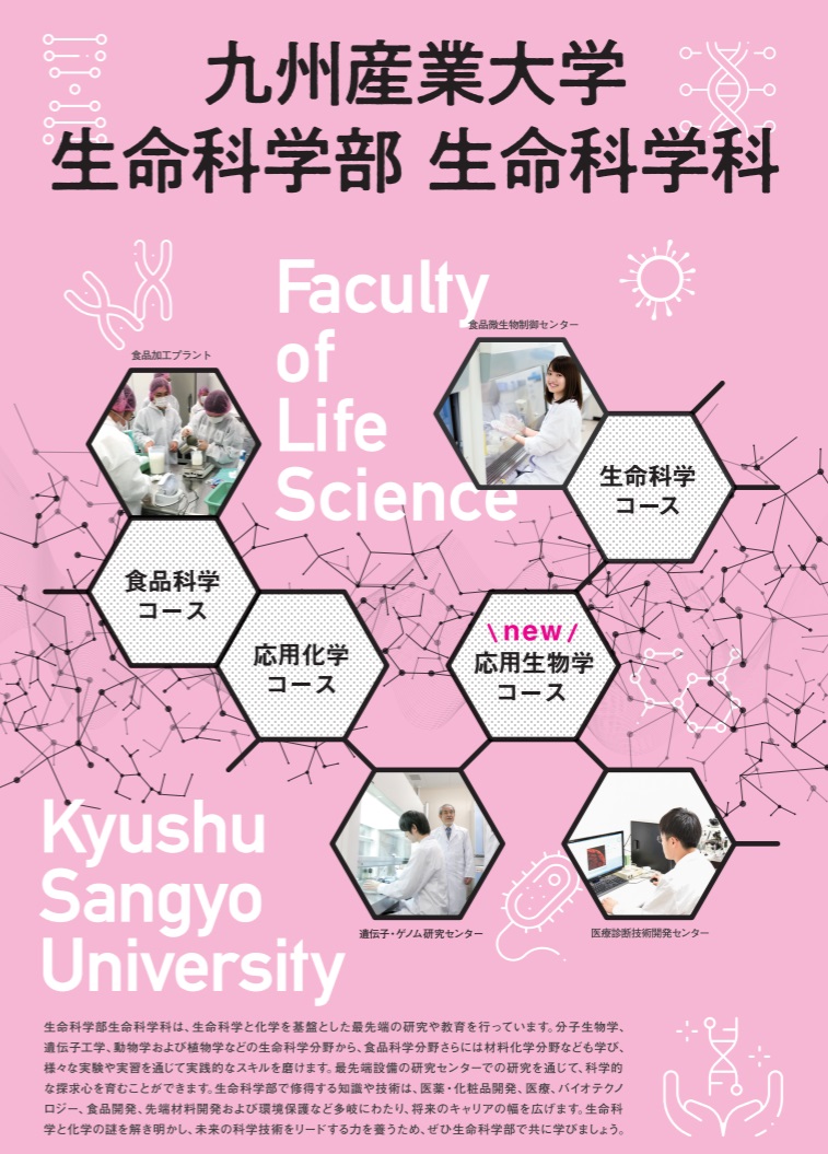 生命科学部の教育・研究内容などを紹介するリーフレットの2024年度版(令和7年度以降の入学生対象)が完成しました。令和7年度からは、従来の「生命科学」「食品科学」「応用化学」コースに加えて、「応用生物学」コースを新設します。
