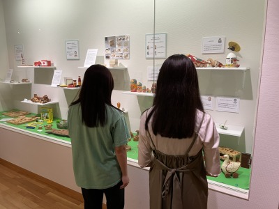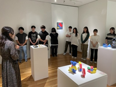 新入生対象の大学スタディスキルの一環として、図書館・美術館見学を行いました。美術館では、所蔵品+展『遊ぶ』-おもちゃと造形をめぐる8章-として、スイスの玩具メーカー ネフ社の作品を中心とした展示物を見学しました。学芸員の方から本学美術館の概要、利用方法説明後、展示物の見学、3階にある彫像なども見学しました。