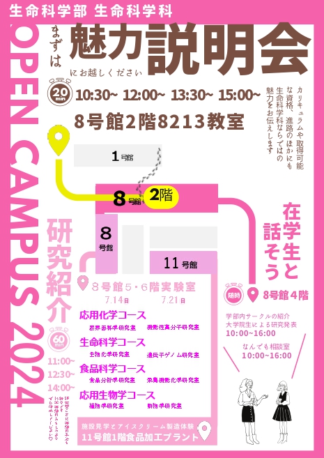 生命科学部では、学部の魅力紹介、新設の「応用生物学コース」を加えた8つの研究室紹介、食品加工プラントでのアイスクリームづくり、大学院生による研究紹介、在学生による学部内サークルの活動紹介、学生・教員との進学相談、総合機器センターの見学、など多彩なプログラムを準備して、全教職員並びに多くの在学生とともに皆様のご来場をお待ちしております。