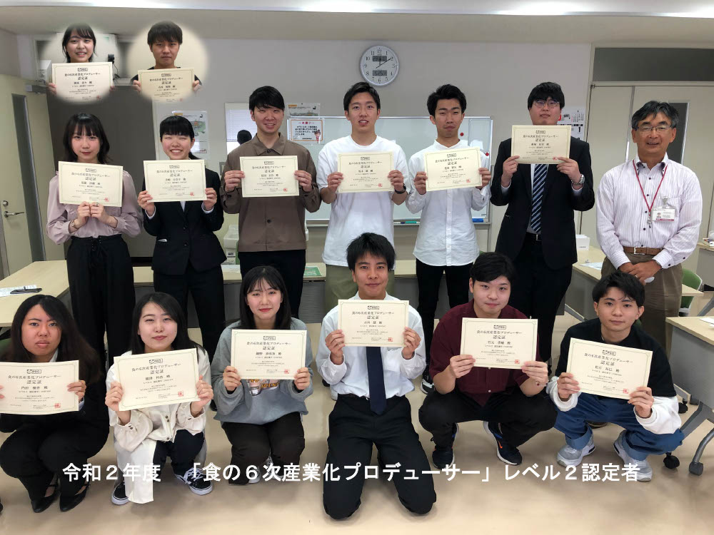 国家戦略プロフェッショナル検定「食の6次産業化プロデューサー」(略称:食Pro.)は、食農分野で新たなビジネスを創出できる人材を育成・認定するシステムです。食品科学コースでは、所定単位取得者が申請し、審査を受けており、令和2年度は14名(令和元年度も14名)がレベル2の認定を受けています。尚、レベルは1から6まであり、レベル2認定者は全国で累計617名(2021年06月05日現在)です。食品企業への就職には有利な資格の一つとなっています。