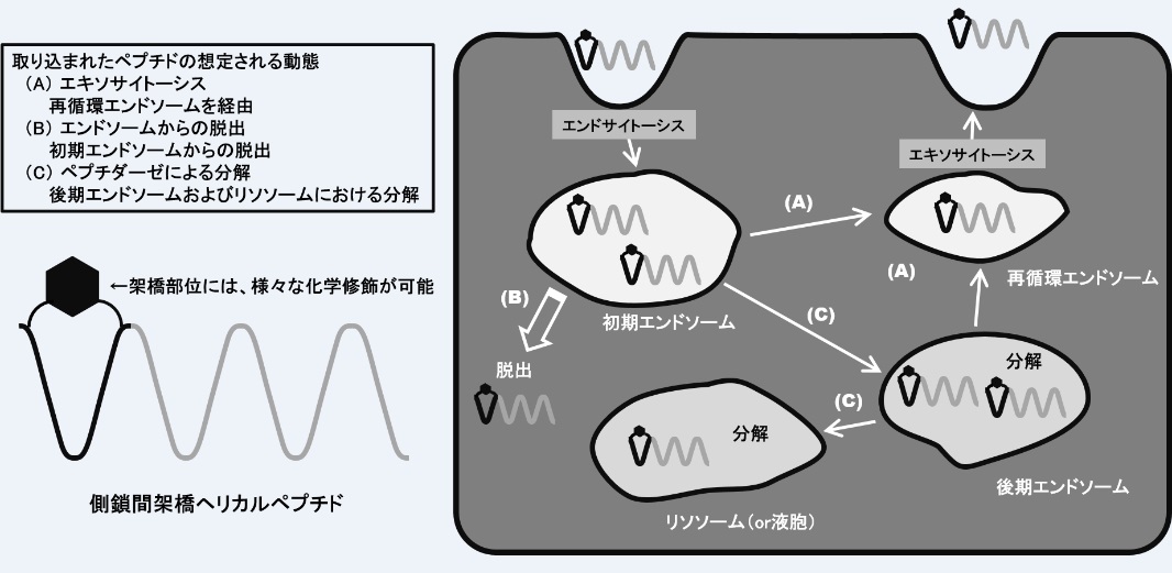 最近、ペプチドを用いた創薬研究が盛んになされています。一般にペプチドは、エンドサイトーシスという機構によって細胞内に取り込まれます。エンドサイトーシスとは、細胞膜の一部を使用して取り込む分子を小胞体(エンドソーム)として抱合し、細胞内部に取り入れるものです。取り込まれた分子は、エンドソームからの脱出、エキソサイトーシスによる細胞外への排出、リソソームにおける分解のいずれかの道をたどることになります(下図参照)。しかしながら、この辺りの機構は全般的に明らかになっていません。ペプチドを医薬品として役立てるためには、こうした機構を少しでも解明していく必要があります。そこで私達の研究室では、以前開発した側鎖間を橋渡ししたらせん構造(α-ヘリックス構造)のペプチドを用いて、これらを解明しようと日々研究を行っています。