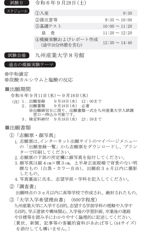 課題解決型入試の一次選考は、高校の教科書に載っている簡単な模擬実験を行い、レポートを作成して頂き、実験態度やレポートの内容で合否を判定する入試となっています。