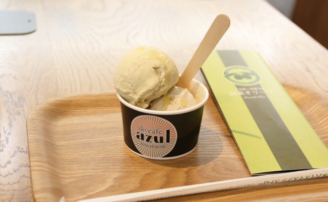 大分県国東産のオリーブを丸ごと使ったアイスが大分空港内の「skycafe azul」の新メニューとして登場し、12月11日(土)、レシピを開発した生命科学部食品開発研究会のメンバーが空港内の売店で販売支援を行いました。オリーブの成分分析を行なう過程で、種にもポリフェノール類が多く含まれていることが分かったため、種を取り除かずに果実丸ごとを滑らかなペーストにした新たな食品素材を利用しています。