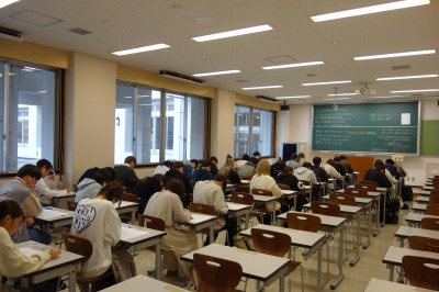 生命科学部では、数学、化学、生物の3科目について、高校の学習内容に関する基礎的問題を出題し、それぞれ50分間かけて解いて頂きました(学籍番号順に3教室に分かれて実施しました)。