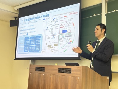 化粧品業界の魅力やメーカーの業務内容を中心として、業界への適性や学生時代の学びなど大変有用なお話視をして頂きました。儀間先輩、有難うございました!