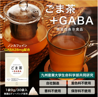 本品はごまミールを主原料とする混合茶で、ティーバッグ 1 袋 9g あたりGABAを 28mg含み、高めの血圧を下げる機能や仕事・勉強による一時的な精神的ストレス、疲労感を緩和する機能を持つ機能性表示食品(届出番号 J376)です。