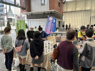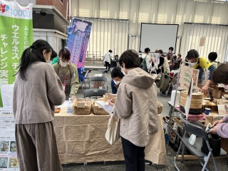食品科学コース2年次生による「伝統的パン種における微生物の役割解明と福岡県特産パン種の開発」プロジェクトの成果発表が久留米市六角堂広場のマルシェにて行われました。開発した九産大オリジナル天然酵母パン5種(作製した桃と梨のサワー種を使った、カンパーニュ・メロンパン・カップジャムパン)60個は、約1時間で完売するなど大成功の内に終了しました。