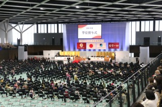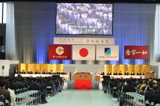 本日、本学にて学位授与式が挙行されました。まず大楠アリーナにて全体の式典が行われ、その後は各学部に分かれて学位記の授与が行われました。学位記授与に先立ち、学部長賞や学会賞の授与などもおこなれました。