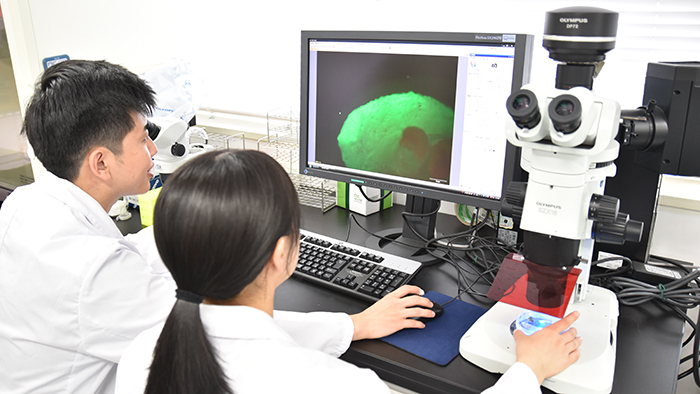 不妊治療、和牛の繁殖率向上、絶滅危惧種の保護など、多くの分野の発展に貢献することを目指して、生殖機構解明の研究を行っています。研究室ではマウスなどの小型哺乳類を用いて、配偶子形成や受精にかかわる遺伝子やタンパク質の解析を行います。