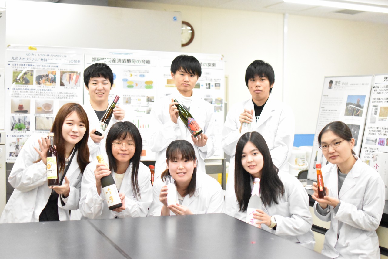 微生物は目に見えない生物ですが、食品・医薬品・新素材・エネルギーの生産、また環境浄化など私たちの暮らしを支えている大きな存在です。発酵学研究室では、微生物の有用なはたらきである「発酵」について研究を行い、商品開発を通して地域の活性化を図っています。現在は、主に日本酒や焼酎の製造の主役となる微生物の一種「酵母」や「麹菌」を対象として、自然界からの分離(探索)や育種(改良)を行うことにより、香味に特徴を持った酒類の開発を、福岡県内の酒造メーカーとの共同研究によって進めています。当研究室は試験醸造免許(清酒、焼酎、果実酒、リキュール)を有しており、分離・育種した微生物の醸造適性の評価を行うために、研究室内にて清酒・焼酎・果実酒の小規模製造もおこなっています。これらの成果により、種々の清酒・焼酎・果実酒の開発に成功し、一部は市販化されるまでに至っています。現在は新たなジャンルとなる醸造酒やバニラ香を特徴とした焼酎の開発を微生物の研究を通じて行っています。