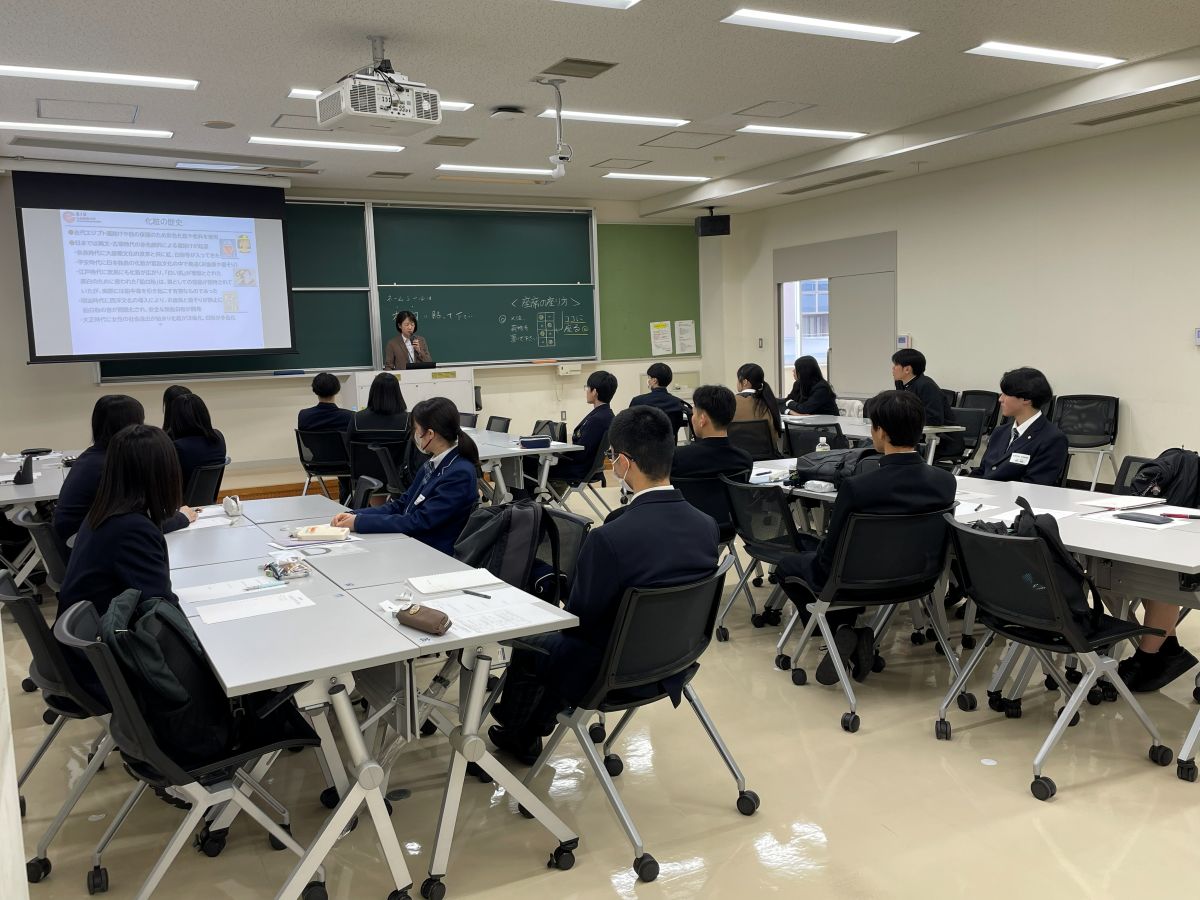 続いて、3つのテーマ(化学・化粧品・水産生物)について教員による講義を行い、本学部での学びの特色や専門分野の魅力について紹介しました。大学での学修内容を具体的にイメージする機会となりました。